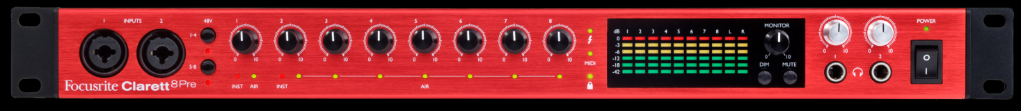 Clarett 8Pre USB is an 18-in, 20-out audio interface. Six-segment LED metering easily shows the signal level of the eight mic/line inputs, two of which are also high-impedance instrument inputs that can record super-hot pickups with no unwanted distortion.