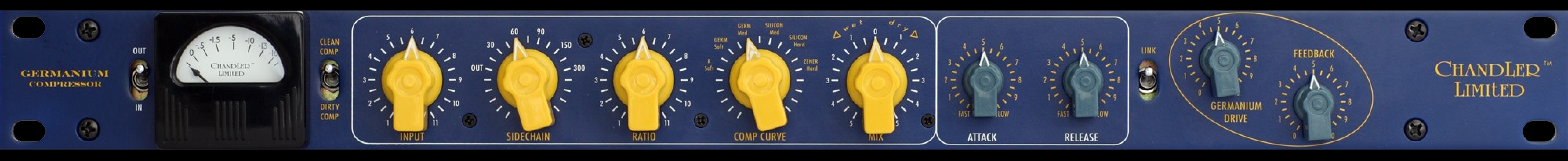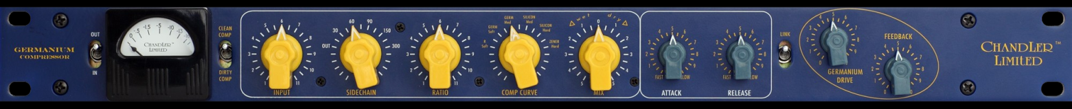 The Germanium series continues with the GERMANIUM Compressor. The Germ Comp starts with the same all class A amp found in the Germ Pre and Tone Control and is transformer balanced in and out. The compression circuit uses an FET gain reduction element but with the tricks and flexibility of all the Germ units. Some of the most notable additions include a Wet/Dry mix (for "submixing" tracks within the comp), Comp Curve (which selects the knee using various diode combinations), Clean/Dirty comp and Sidechain filter. Many of the Germ Comp parameters have been purposely set by studio use and listening not by over analyzing them with test gear. The result is a musical powerhouse ready for tracking, mixing, and mastering.